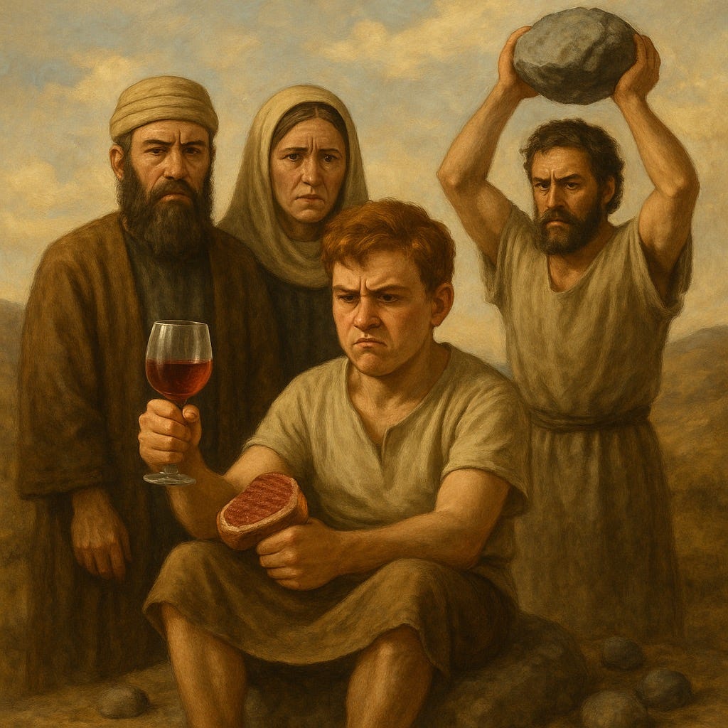 He steals from his parents and squanders the money on steak and fine wine. When he is caught and whipped he promptly returns to his thieving and gluttonous ways. He is known as the rebelious son. His punishment? Death by stoning.